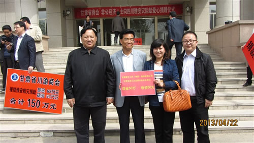 2013年4月22日下午15時(shí),在甘肅省政協(xié)一樓,由甘肅省委常委、省委統(tǒng)戰(zhàn)部部長(zhǎng)澤巴足,省委統(tǒng)戰(zhàn)部副部長(zhǎng)、甘肅省工商聯(lián)黨組書記、第一副主席吳繼德等相關(guān)領(lǐng)導(dǎo)出席了“甘肅省商會(huì)非公經(jīng)濟(jì)人士向四川雅安災(zāi)區(qū)獻(xiàn)愛心捐贈(zèng)儀式”。捐贈(zèng)現(xiàn)場(chǎng)眾多甘肅省非公企業(yè)向4月20日雅安市地震災(zāi)區(qū)進(jìn)行了捐贈(zèng),廣大愛心企業(yè)和人士用自己的實(shí)際行動(dòng)對(duì)災(zāi)區(qū)同胞奉獻(xiàn)了自己的真情和祝福。