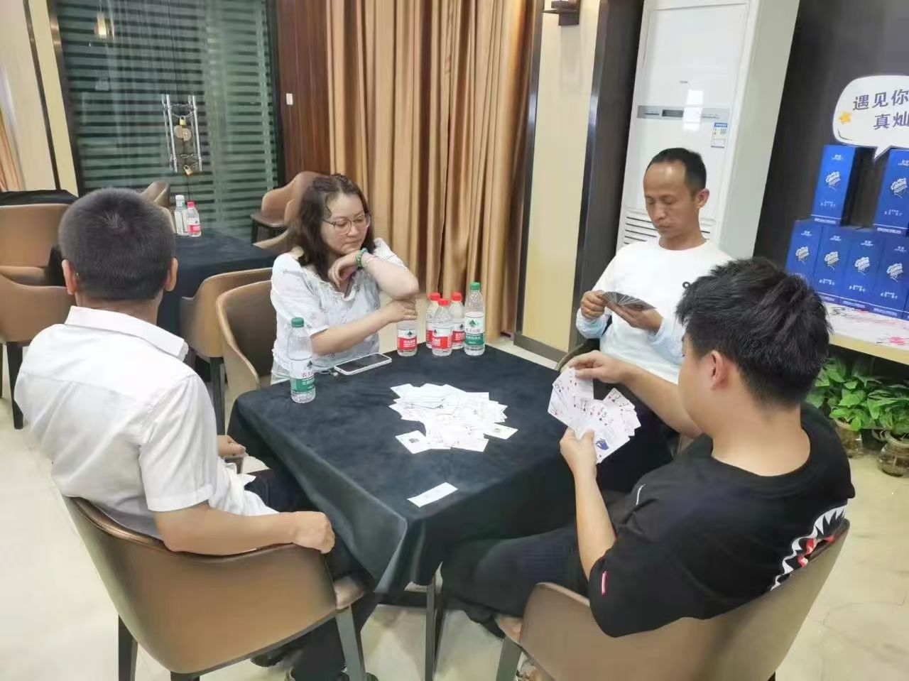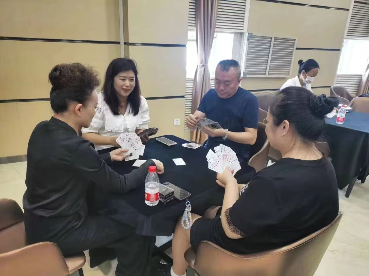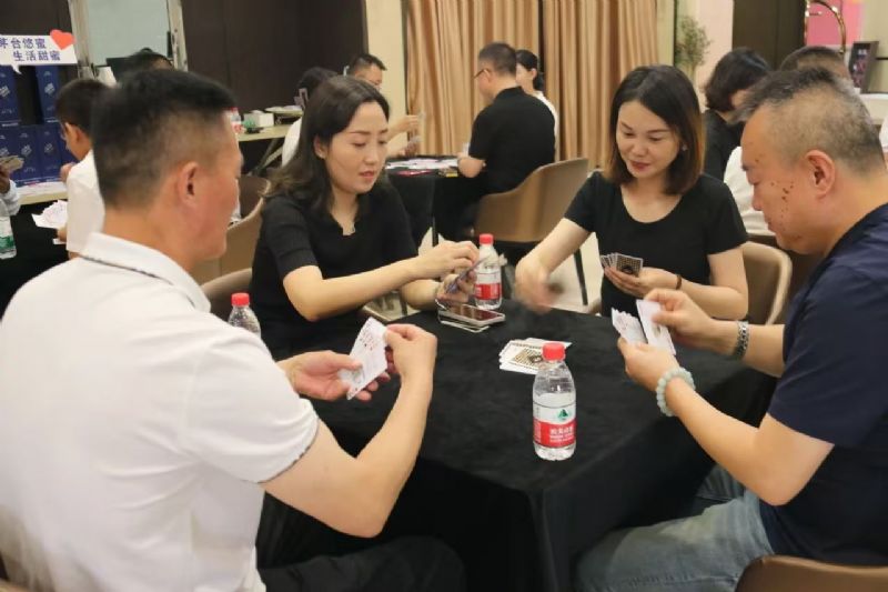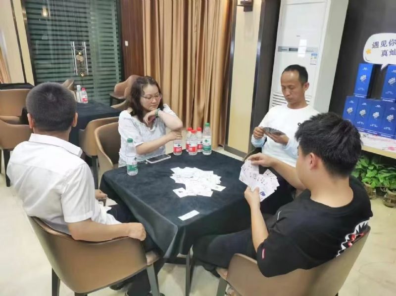 在運(yùn)動(dòng)會(huì)的摜蛋比賽現(xiàn)場(chǎng),氣氛熱烈而又緊張。一張張牌桌整齊排列,參賽選手們兩兩相對(duì)而坐,神情專注而投入。他們的目光緊緊鎖住手中的牌,大腦飛速運(yùn)轉(zhuǎn),思考著出牌策略。每一次出牌都顯得深思熟慮,又充滿了果斷和自信。